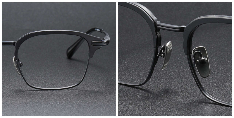 This clubmaster style has an emphasized bold brow line polished titanium rimmed square lenses.