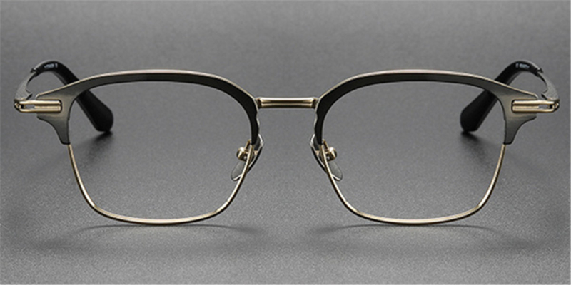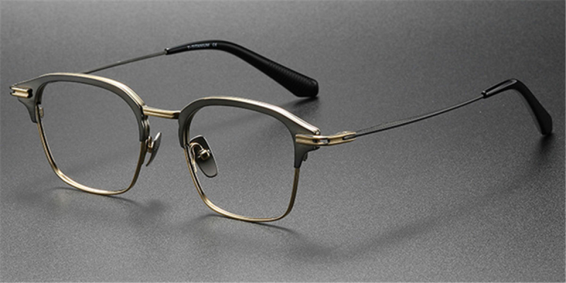 This clubmaster style has an emphasized bold brow line polished titanium rimmed square lenses.