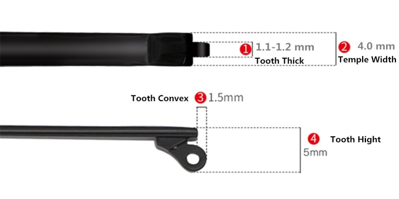 Eyeglasses Temple Width is 4.0 mm, tooth thick is 1.1-1.2mm,tooth convex is 1.5mm, tooth hight is 5.0mm.