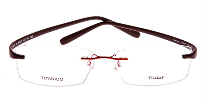 Integrating a timeless rimless rectangle design with straight lines and unique temple detailing, this frame exudes the old-school charm of England. Red Titanium metal for bridge and nose pad gives a high-end feel, while adjustable brown Titanium temple tips mean these eyeglasses are comfortable as well as chic.